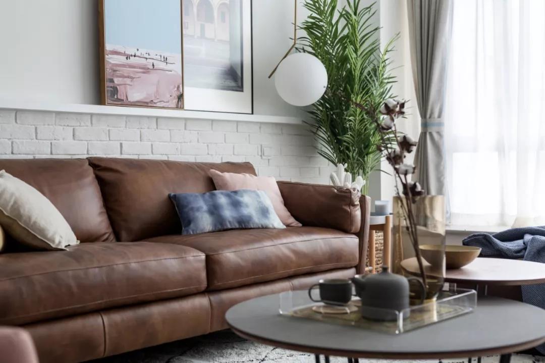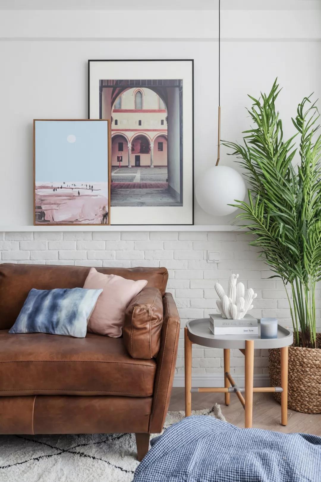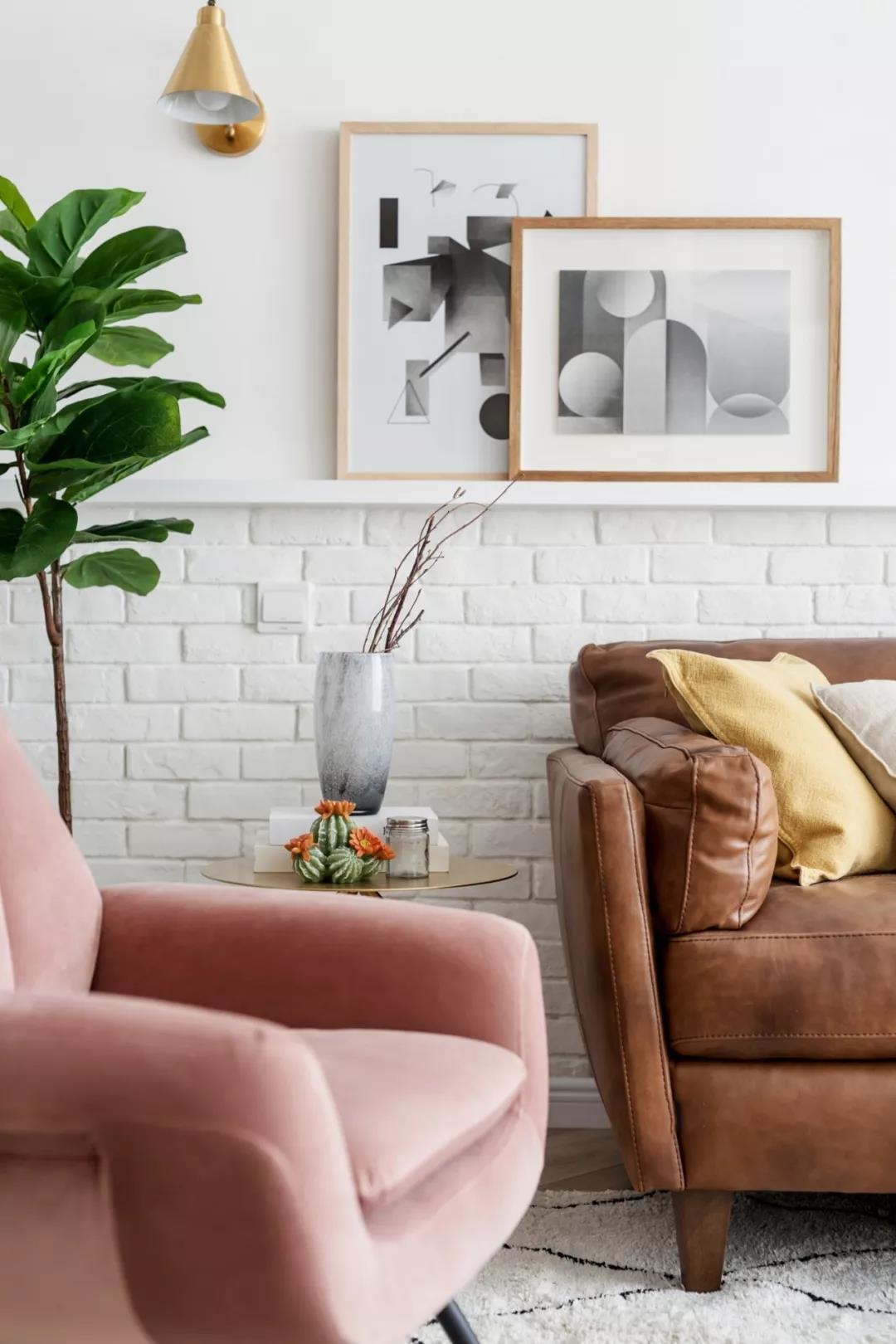 白色的墙砖,复古的棕色皮质沙发,粉色和印染的布艺抱枕,琴叶榕盆栽,客厅一角,