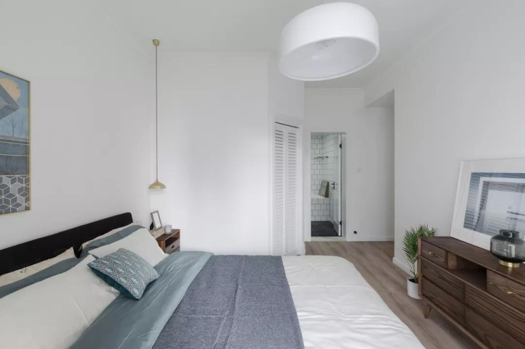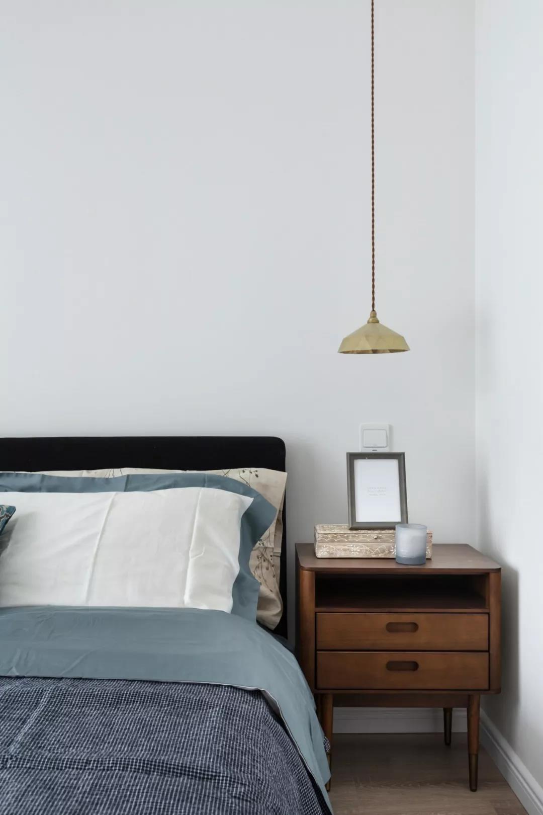 四面白墙,没有任何修饰,对称设计的床边几,采用不对称的灯饰,一边精致小巧,一边线条感十足,